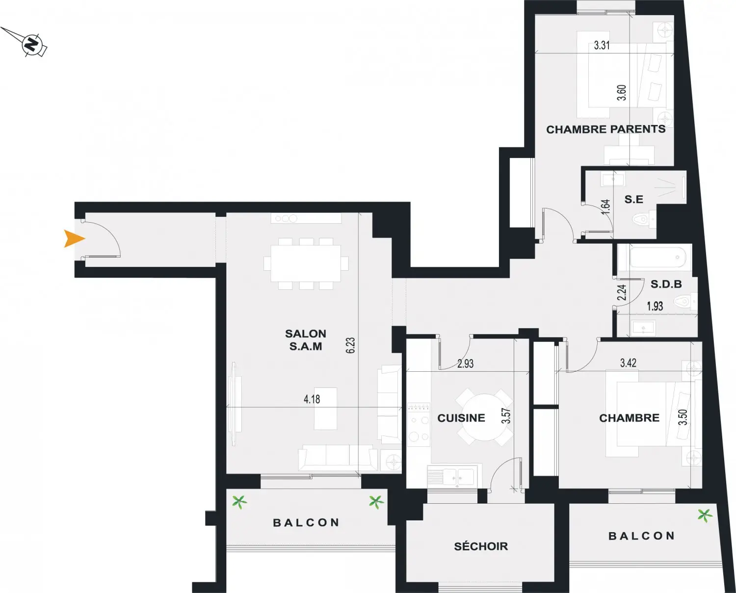 Appartement S+3 situé au 3e étage, bénéficiant d’une organisation fluide des espaces, d’un accès pratique et de confort optimal.