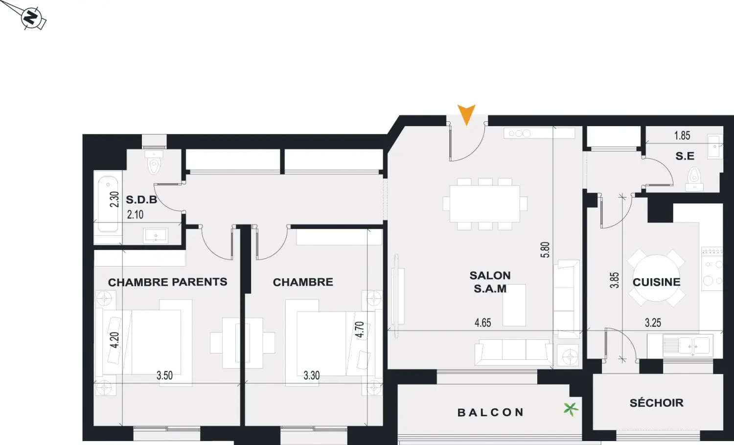 Appartement S+2 situé au 4e étage, offrant une répartition fonctionnelle des espaces, un accès simple et un confort optimal au quotidien.